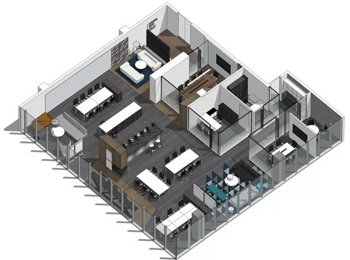 除了會議,接待,財務等必要的安靜空間,其余均采取開放式復合型處理辦法。以期達到多場景切換,場景間快速互動的有趣輕松的辦公氛圍。