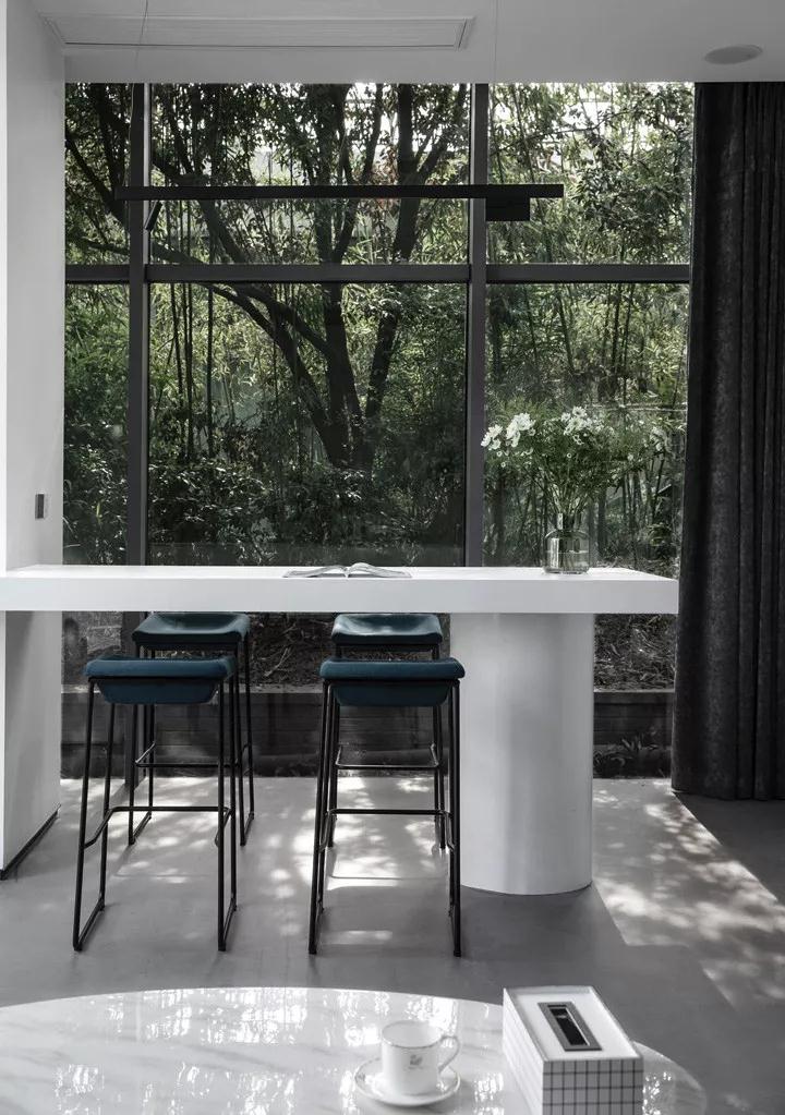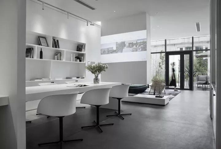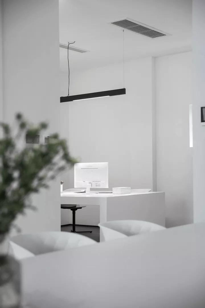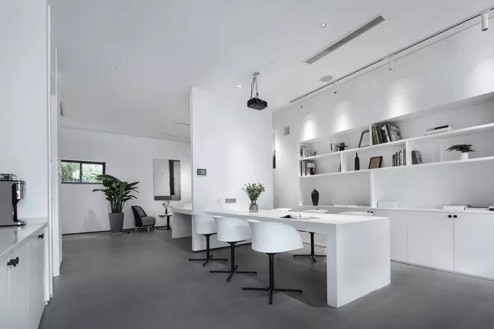 在色彩上,回歸對(duì)“無”的一種思考。設(shè)計(jì)需要一種克制的色彩,而且充滿張力和想象力。在豐富多彩的世界里,白色最接近內(nèi)心,最為尊貴,也許是最絢麗多彩的顏色。設(shè)計(jì)師選擇了白色,白色的天花,白色的墻面,白色的家具,少許低飽和度的綠色統(tǒng)一在灰色水泥地面中,形成對(duì)比,促進(jìn)著情緒和情感的激發(fā)。