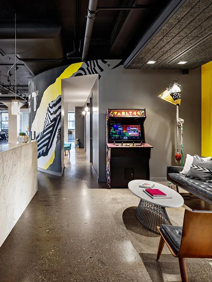 品牌創(chuàng)意設(shè)計(jì)機(jī)構(gòu)Vault49,公司起源于倫敦傳播學(xué)院的版畫室里,創(chuàng)始人在那里不期而遇,暗中相互覬覦對(duì)方的作品,合作的野心由此蔓延,兩個(gè)街頭藝術(shù)家成就了到世界創(chuàng)意工作室的傳奇故事。本案是其位于紐約的總部辦公室,Capital C Interiors裝修設(shè)計(jì)團(tuán)隊(duì)打造。