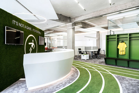 深圳裝修公司使該團(tuán)隊(duì)經(jīng)典的黑白配色則凸顯了整個(gè)設(shè)計(jì)的特點(diǎn)。納米層壓板,天然木貼面,再生塑料地板和皮革內(nèi)飾融合了色彩和材料的平衡。充足的自然光增強(qiáng)了與室外的聯(lián)系,而LED照明系統(tǒng)則經(jīng)過(guò)專門(mén)設(shè)計(jì),深圳裝飾公司在裝修設(shè)計(jì)中使人們可以專注于俱樂(lè)部紀(jì)念品和墻上的品牌視覺(jué)元素。