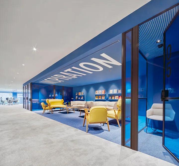 該項目位于西班牙巴塞羅那的dau大樓的六樓,主要用于西班牙金融服務公司的創新和營銷部門。該案例是由深圳裝飾公司的設計團隊創建的。內部顏色主要是藍色和黃色,來自公司的圖像徽標,在這種情況下,最終實現了該空間的驚人視覺效果。藍色調的色彩表達,深圳裝飾公司在會議室和休息區的墻壁,頂面和地板上呈現了最極端的方法,由色彩形成了高度獨立的空間。